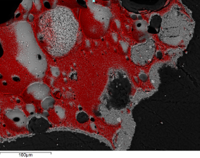 Obrázek ukazuje řez porézním zrnem kompozitu snímaný skenovacím elektronovým mikroskopem. Zeleně je znázorněna vrstva oxidu titaničitého (fotokatalyzátoru) o tloušťce 10–30 µm. Červeně je vyznačen křemík, který ve formě oxidu křemičitého tvoří hlavní složku nosiče.